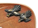 夕映えの空を思わせる素 銅磨地。撫角形の中央を絞った印象深い造形はどことなく糸巻にも似て、鐔全体で織姫を連想させる。打ち返し耳に敢えてかかるように三日月を配し、わずかに鋤き出して石目地を施した橋の傍らに二羽の飛翔する鵲を赤銅地高彫象嵌して七夕伝説を表した、春明の心憎い洒落た画面構成である。春明は柳川直春の門人。独立後はたびたび東北を訪れ、出張制作をした。漂泊の俳人、絵師など地方の裕福な商人や地主などに請われ、その土地へ赴いて制作または指導をした松尾芭蕉や与謝蕪村のように、春明もまた北国へ赴いたのであろうか。旅による制作への刺激も多かったことだろう。会津金工の明義や明周、田辺伴正、田辺明伴、大石明親など優れた門人も養成した。晩年の弘化、嘉永頃は越後地方を遊歴。嘉永辛亥(1851年)初秋と刻された本作は越後にて制作されたものであろう。