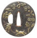 そもそも犬が画題として取り上げられることが珍しい。しかも時代の上がる鐔に、である。画題としての犬は、じゃれあう仔犬や、座頭に絡む野犬、野晒とともに描かれる餓狼などが典型。本作のような猟犬が描かれるのは極めて珍しい。蓑笠を付けた人物の後を追う犬の全身から嬉しい楽しい気持ちが伝わってくる。絵風鐔への過渡期と考えられる作。引き締まった小振りの鉄地全体に展開する真鍮地高彫象嵌は、それぞれ関連性があるのか無いのか不思議な取り合わせである。しかも木賊を刈る人よりも巨大な海老やカマキリ、野菊など、何を基準としてそうなったのか、できることなら作者に聞いてみたい。現代の感覚では捉えきれない面白さが凝縮されている。実用の点からの不思議は小柄櫃に設けられた鉄地の当て金である。小柄のためなら柔らかい銅を用いた方が良いのではないか。全体の色合いを変えたくないという美観を追求してのことだったのだろうか。謎多き鐔の最大の謎を最後に。裏面の茎櫃周辺の一部に魚子が撒かれているのだ。赤銅魚子地の古金工や古美濃の鐔の切羽台には、試し打ちであろうか、稀に数条の魚子が撒かれていることがあるが、鉄地の切羽台に魚子が撒かれているのを初めて見た。滑り止め?どなたかご存知ならご教示願いたい。