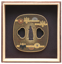 古典的な文様表現を基礎として京に栄え、阿波国に移住して個性を成した阿波(あわ)正阿(しょうあ)弥(み)派には、一段と華やかな意匠の作があり、鐔の作風の見どころともなっている。この鐔は、渋い色調の真鍮地を石目地に仕上げて山銅のような古寂な風合いを背景としている。樋定規と家紋の採り合わせは古典的な図ながら、ここでは五三桐紋に菊紋を金銀赤銅素銅の色金の組み合わせで洒落た画面に仕上げている。耳に施された鮮やかな金覆輪によって美観が高められている。