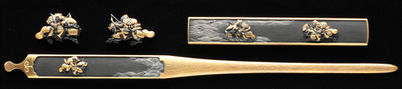 平家の御曹司無官大夫敦盛と源氏の熊谷次郎直実の、一ノ谷の合戦でのやり取りを題材に得た三所物。『平家物語』の名場面である。極上の赤銅魚子地に後藤家らしい的確な彫技と色絵で、扇を掲げて呼び掛ける熊谷と、海原に進ませた馬を止めて振り返る敦盛の姿が活写されている。作者は元和三年に後藤宗家七代を継いだ名手顕乗で、十三代光孝により極められて小柄と笄に裏彫が施され、同十四代光守の代金二百五十貫の折紙が付されている。赤銅の漆黒に金が映え、大身の武家の道具に相応しい貫録ある逸品となっている。
