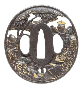 高士清遊や竹林の七賢人、宇治川先陣といった和漢の人物図を表情豊かに詳細に彫り描き、色金を象嵌して華やかに彩った江戸中期の金工喜多川宗典。その作風を色濃く表し、竹林に集って清談に興じる賢人らを奥行きのある空間構成で立体的に演出した作。七人それぞれ衣の模様が異なっているところも好ましい。無銘ながら「彦根」と分類される鐔である。