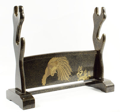 洋では不死鳥と捉えられた鳳凰と桐樹を様々な色調の金粉蒔絵で描いた刀掛。黒漆地に細やかな金の平目地で叢梨子地として清く澄んだ空気感を表現。鳳凰と桐樹は盛上蒔絵の手法で梨子地に浮かび上がる。美しく流れるような飾羽根と身体の曲線、尾羽根の背後に描かれた唐草風の文様も神秘性を高めている。柔らか味のある鳳凰の身体は、金、銀、朱、淡い緑などに色を違えた金粉をふんだんに用いており、所々に金の切金を配して豪華さを演出している。殊に尾羽根の表現は多彩で、金泥の他に鮮やかな金粉、青貝、金の切金を巧みに組み合わせており、繊細な線描が美観と立体感を高める要素となっている。刀掛背面は桐葉散しで、これも多彩な手法になる蒔絵。「昭堂」と銘がある。