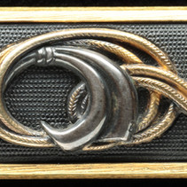 鷹匠道具を題に得た風格のある小柄。後藤宗家八代即乗の作であることを、同十三代光孝が極めている。綺麗に揃った漆黒の赤銅魚子地を背景に、彫際のくっきりとした高彫と金銀の色絵で大緒(おおお)を表現している。武士にとって鷹狩は遊興にあらず。狩は源頼朝の富士の巻狩で知られるように、兵を動かす戦の訓練でもあった。一方で天皇が鷹狩に勤しんだように、高貴な遊興の面を備えていた。本作は、鷹は描かれていないものの、この道具一つだけで緊張感に満ちた画面とされている。
