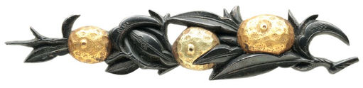 正月飾りとして知られる橙(だいだい)。一つの株に数年代の果実が実ることから「代代栄える」の意味で「だいだい」と呼ばれるようになったという。冬に橙色になった果実を収穫せず枝に残しておくと夏には緑色に戻り、冬になると再び橙色になるという不思議な果実でもある。60mmを超える長い目貫である。赤銅地を打ち出し強く立体的に仕立て、橙の表面には柑橘類特有の凹凸を打ち込んでいる。橙の金色絵は色味を変え、硬く弾力のある葉は鋭く尖り、所々虫食いの跡が彫られている。