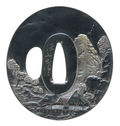 この鐔は、古典を手本としながらも我が国の風情を漂わせる美しい景観を捉えた作。いかなる山中に取材したものであろうか、あるいはまだ見ぬ大陸に思いを馳せ、理想郷として描き表したものであろうか。懸崖の連なる大陸の絶景とは異なる穏やかな山並みながら、わずかながら雲間に切り立つ山の端が窺いとれ、興味は否応なしに想像世界へと広がる。このように思い描く理想空間こそ山水画の本質であり、他の分野に視野を広げれば、古くからある盆景や盆石、盆栽などに求められる自然素材による創造空間にも通じるであろう。
