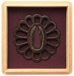 菊花透は秀逸なデザインだが、透の幅の広狭で受ける印象がまるで違うのは面白い。切羽台の片面を深く掘り下げて空隙を作ったのは切羽同様に衝撃を吸収するためであろう。素朴で温かみのある山銅地には数百年の時が降り積もり濃淡様々な表情を見せる。室町時代の腰刀に装着されたものである。