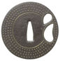 装飾は打ち鍛えただけの鉄地板鐔に円周状に打ち施された真鍮の粒と小透、さらに小透を装うような線象嵌だけ。装飾の進化が突然に起こったとも言えるのが、この応仁(おうにん)鐔だ。即ち、甲冑師や刀匠鐔などのような素朴な仕立ての鐔に、真鍮の点象嵌や線象嵌を加えるとこうなる。カランと乾いたような響音を成す地鉄は、鍛えた鎚の痕跡でいかにも質素。透しの形状は雫を思わせるも、実は謎めいており、現代の鑑賞者を悩ませるところにも魅力がある。