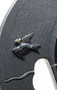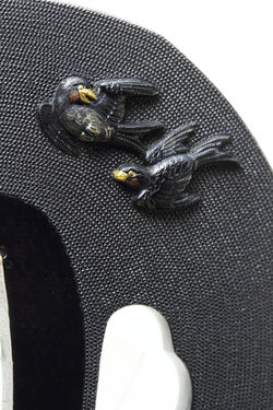 園部芳英は芳継の子で文化三年の生まれ。精巧緻密な高彫表現を得意とした。この鐔は、春の暖かい風を切り裂いて飛翔する燕を彫り描くことで、どこまでも青く清らかに澄む空気を表現した鐔。涼やかに流れる小川と、そのほとりに咲く蒲公英、土筆、遠く広がって天に溶け込む大地も、総てが空気のありようを演出する素材。陽の光を大地に届けてくれるのが空気。円周状に打ち施した魚子地も燕や草原に生命感を与えている。赤銅の黒、銀の白、目玉の金、頬の素銅とわずかの色金ながら、写実的高彫描写された燕は細部まで精密。小川の流れは高彫で、切羽台のみ銀の平象嵌。総ての彫刻技法が優れて美しい。