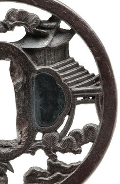 旅姿の人々と松林に囲まれた鳥居と社。鍛え良く黒味の強い鉄地を真ん丸形とし住吉大社に詣でる人を彫り描いた作。奥行きのある肉彫り地透が、旅人になって自分も鐔の中の風景を巡っている気分にさせる。