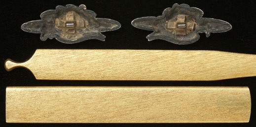 琳派の創作意識が明瞭に映し出された菊水に取材した三所物で、京後藤とも呼ばれて京に栄えた後藤分家の作と極められている。小柄笄の線描写による波はわずかに肉高く、目貫のそれは彫り込み深く、この図では特に重要な部分。菊花は伝統のそれであり、総体の洒落た風合いの中に後藤家によって守られた構成と美しさが濃縮されている。哺金の色合いも鮮やかであり、蝋色塗鞘の拵に映えるであろう。