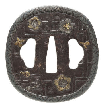 草庵の下地窓から見える梅を文様風に表現した作。切羽台を厚く、耳に向かって肉を落とし、土手耳に銀布目象嵌の山路文を廻らせている。梅の花は金と銀の布目象嵌。江戸肥後または四谷肥後とも呼称された熊谷一派は、肥後細川家の抱え工で江戸四谷に住した。金銀布目象嵌を多用した志水甚吾風の華やかな作風が当時の若い武士達の好みに合って流行したという。今は黒色化し、渋く落ち着いた雰囲気の銀も磨けば白く輝く。若武者はどちらを好んだのであろうか。